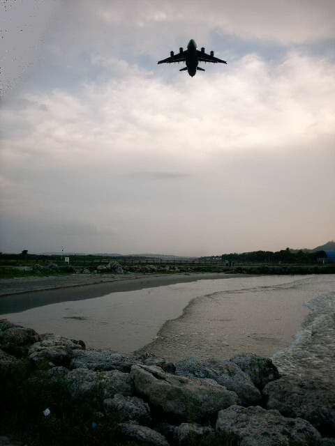 La pista termina contra esta playa, donde vimos algunos de los cargeros, como éste arriba, parte del atuendo del Presidente Bush, despegar camino norte.