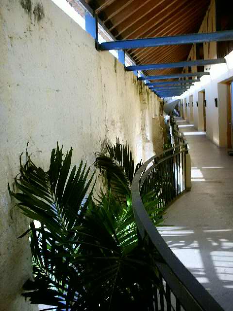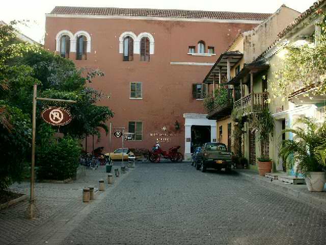 Esta foto. El Hotel Santa Clara preserva la entrada principal del convento del cual presta su nombre. Foto derecha - El hotel es un monumento adentro de otro, abrazando la fachada original del convento a través de un sistema del cual hacen partes las vigas de acero azules que se ven arriba (Foto derecha).